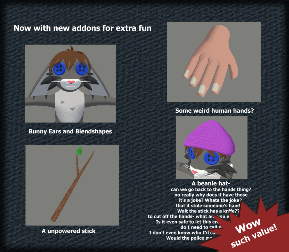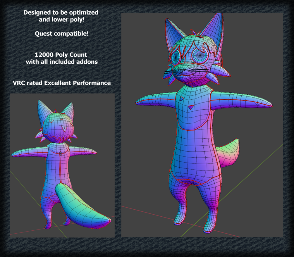 Thanks for checking out my custom avatar Base, the Plushimew is a feline plushie avatar made by me because I wanted a fun plushie style base model. Hope you enjoy it as much as I do, and def let me know if you need help or want to show me what you made. :3