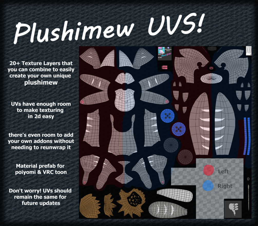 Plushimew fbx, blender file, textures + PSD file, VRChat + Quest + ChilloutVR Prefabs